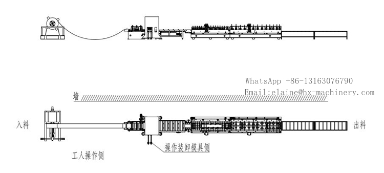Active decoiler ---- Leveling servo feeding integrated machine ---- Punching machine ---- Conveying platform ---- Roll forming machine ---- Discharge